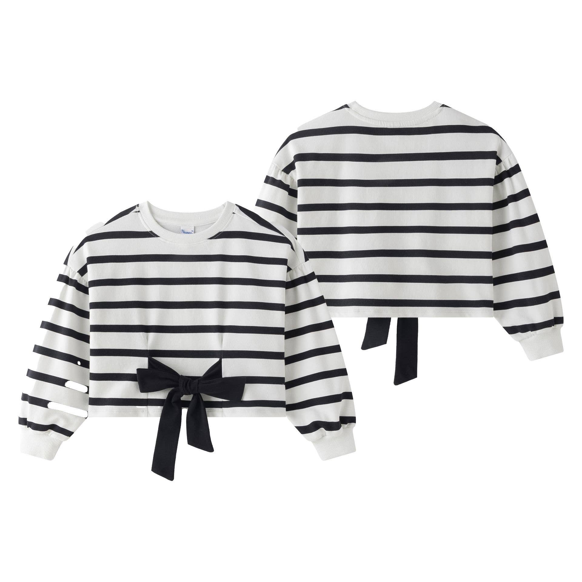 Gestreepte trui met strik aan de voorkant, ballonvormige mouwen.