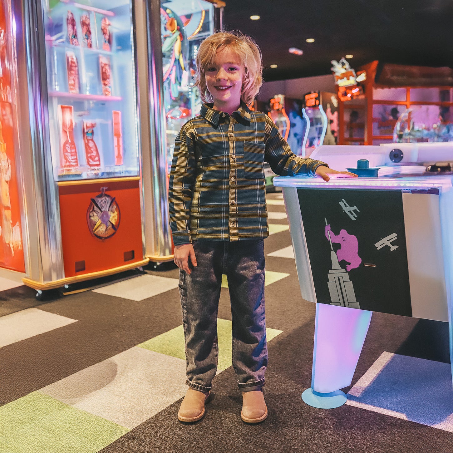 Beschikbaar in maat 80 tot en met 140 en perfect te combineren met denim of cargo. Dankzij de retro kleuren en structuur past dit item uitstekend binnen het gamehall-thema van dit seizoen.