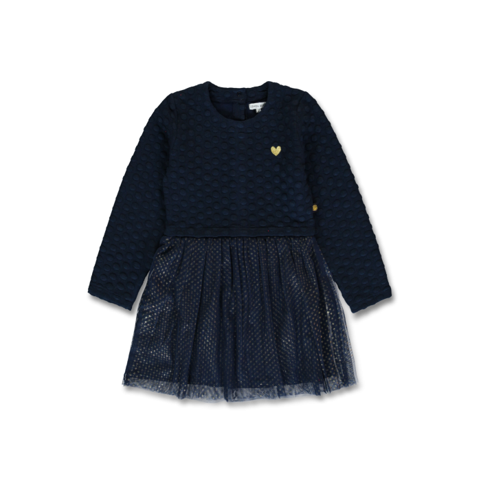 Mooie donkerblauwe jurk met goudkleurige accenten