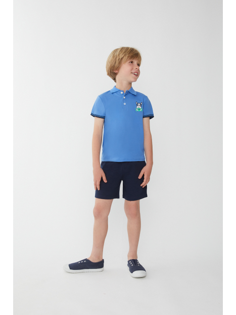 De polo in een zachte blauwe tint is fijn gedetailleerd met een grappige patch van een hond op de borst, wat een vleugje vrolijkheid en karakter toevoegt.