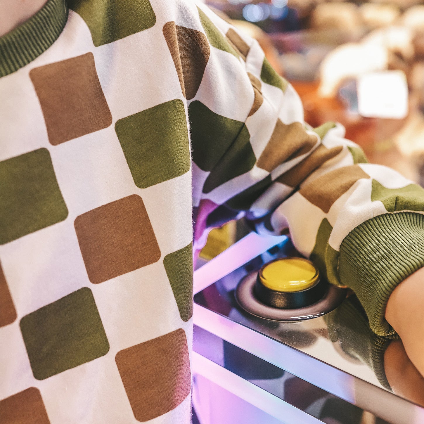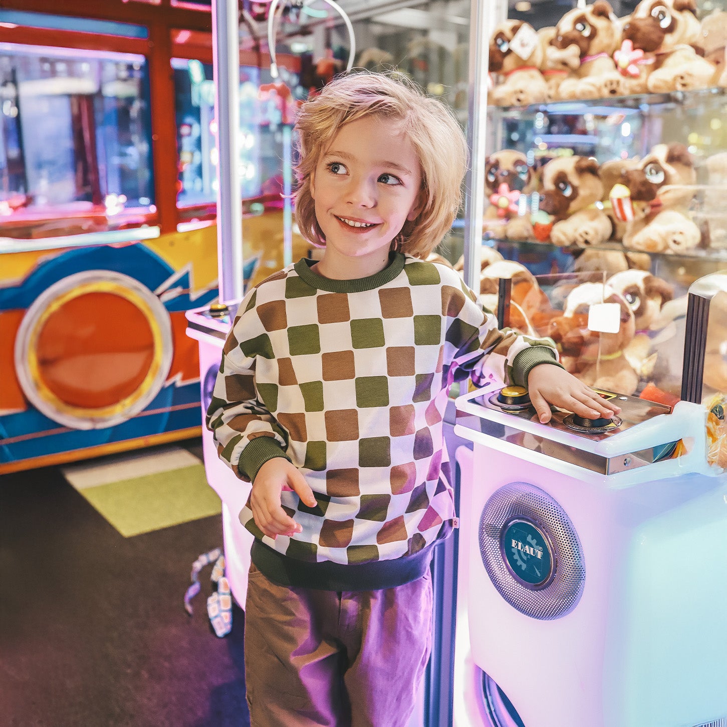 Jongenssweater in brushed french knit met kleurblokken in groen, beige en bruin. Ribboorden aan de nek, mouwen en onderkant.