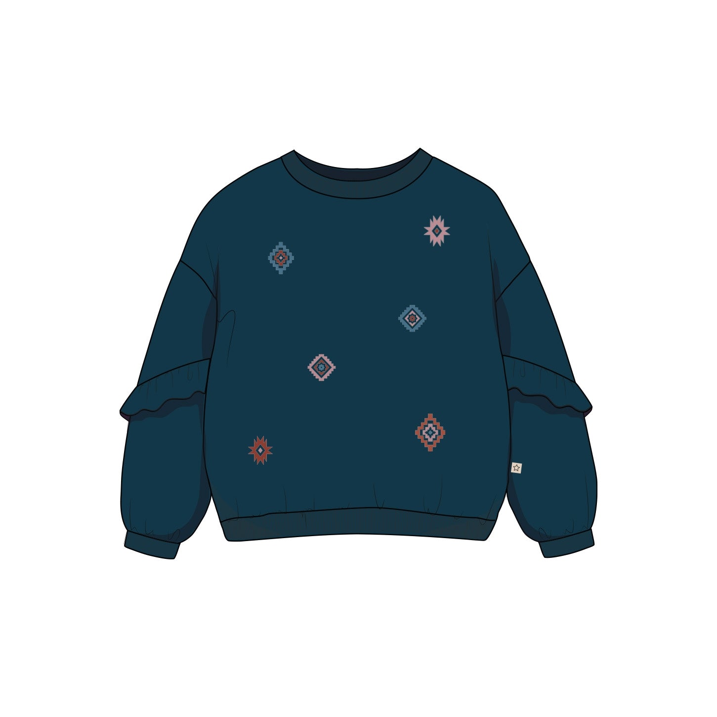 Opvallende elementen zijn de mouw-ruffles in 100% katoen en een fijngeborduurd details op het voorpand in warme, winterse tinten.