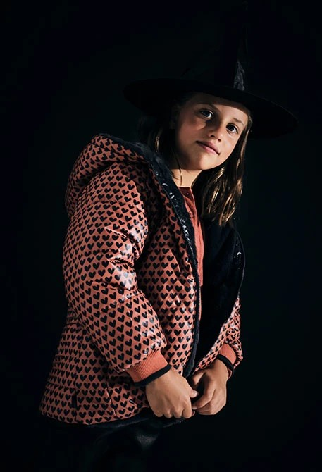 Omkeerbare parka voor meisjes, ontworpen voor het winterseizoen, gemaakt met een charmante print van zwarte hartjes.